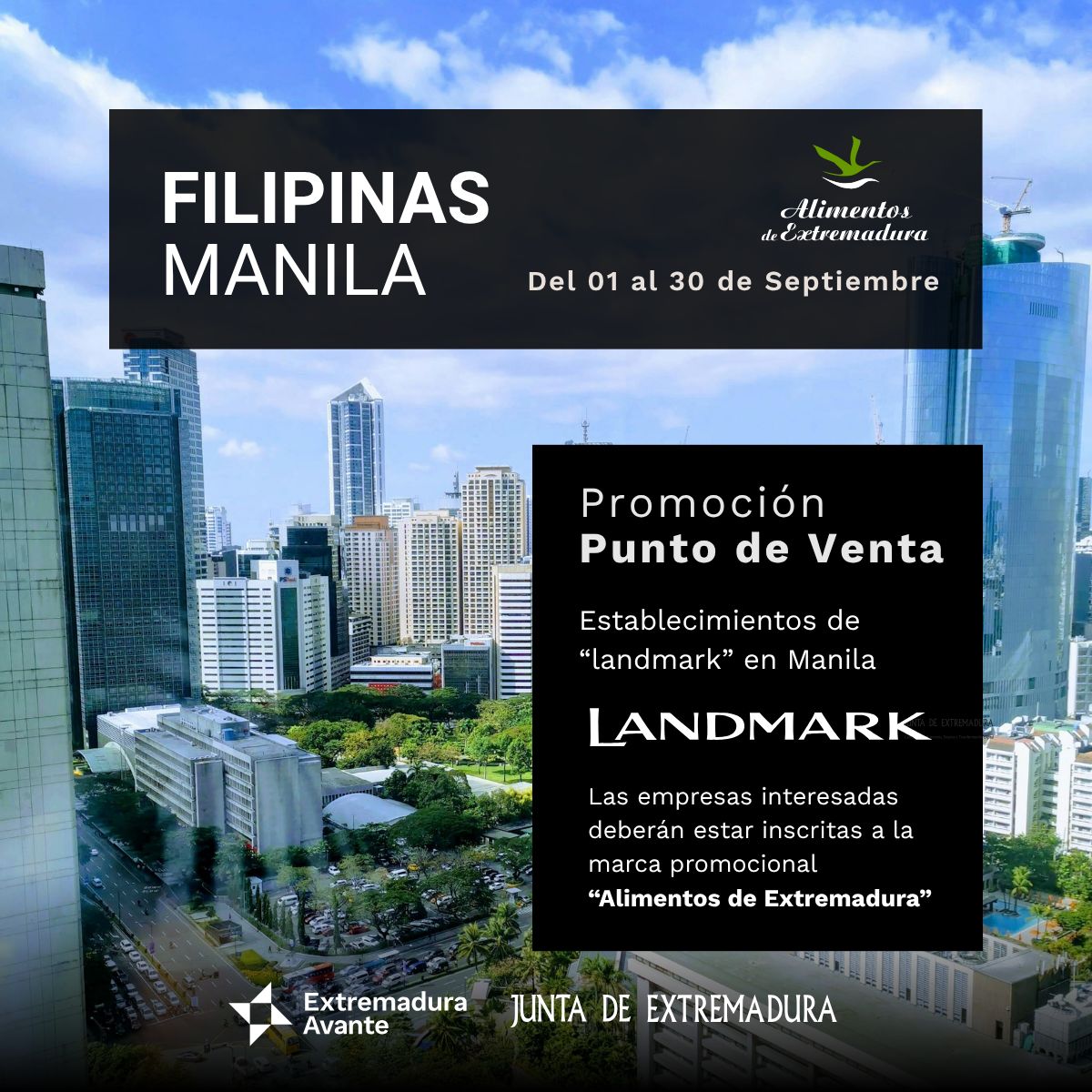 Extremadura Avante organiza una Promoción Punto de Venta de “Alimentos de Extremadura” en los establecimientos de “Landmark” en Manila (Filipinas), con el objeto de fomentar la comercialización internacional de los productos agroalimentarios extremeños. Fecha: 1 al 30 de septiembre de 2026. Lugar: Manila (Filipinas). Datos a tener en cuenta sobre...