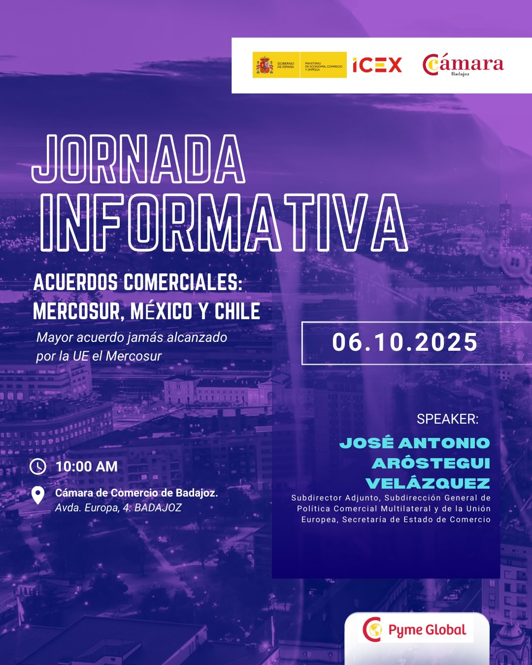 ICEX España Exportación e Inversiones, junto con la Dirección Territorial de Comercio en Extremadura, en colaboración con la Cámara Oficial de Comercio, Industria y Servicios de Badajoz organiza esta jornada el lunes 6 de octubre de 2025 POR QUÉ PARTICIPAR El pasado 6 de diciembre, la Unión Europea y el... Leer Más...